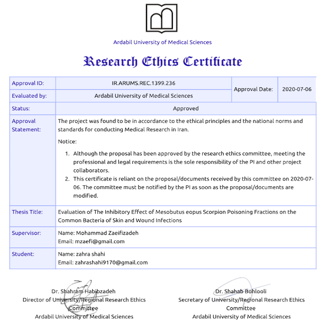 Evaluation of the inhibitory Effect of Mesobutus eopus Scorpion poisoning Fractions on the Common Bacteria of Skin Wound infections