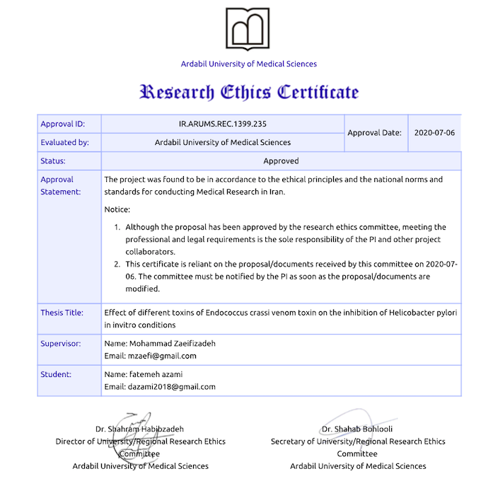 Effect of different toxins of Endococcus cressi venom toxin on the inhibition of Helicobacter pylori in invitro conditions