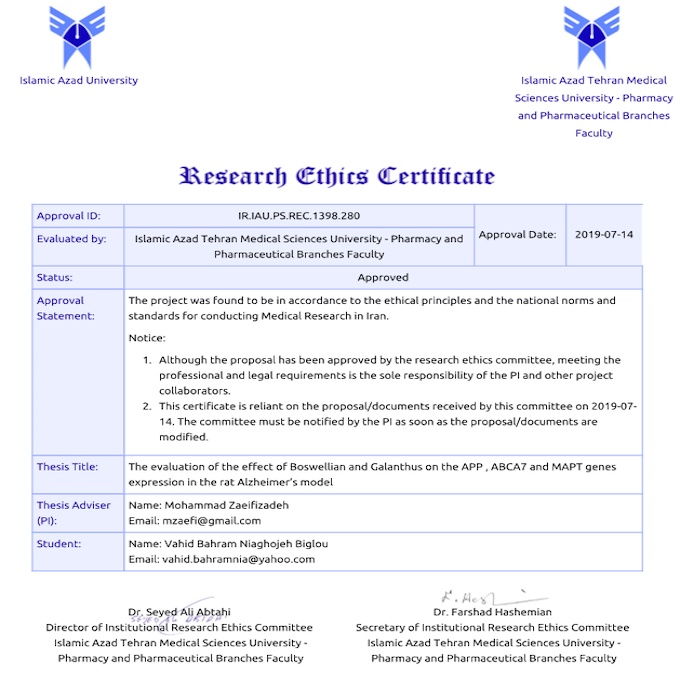 The evaluation of the effect of Boswellian and Galanthus on the App, ABCA7 andMAPT genes expression in the rat Alzheimer’s model